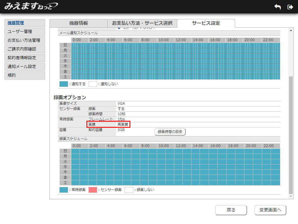 常時録画設定欄にて、「画質選択」ボタンから「高画質」または「高圧縮」を選択し、「変更」ボタンをクリックしてください。