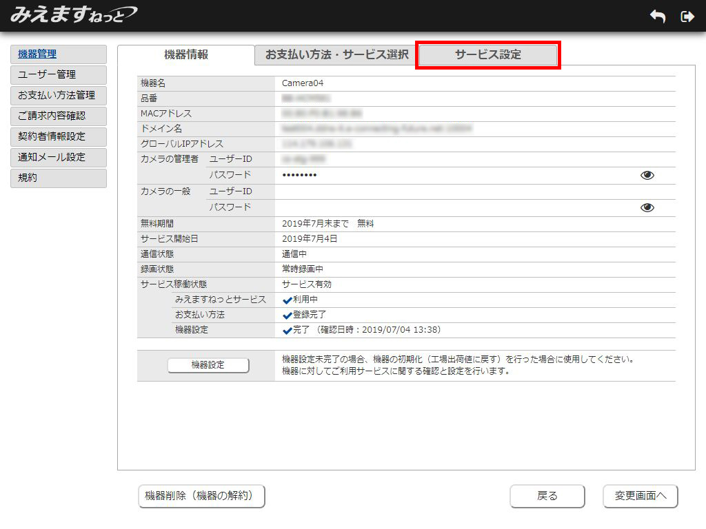 2.機器情報表示画面が表示されます。「サービス設定」タブを選択してください。